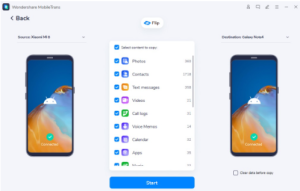 Next, create a link between the Samsung S23 Ultra and Google Pixel 8 Pro along with the computer through a cable. In the upcoming window, identify one device as the “Source” and the other as the “Destination.” Use the “Flip” button at the center to interchange their positions if necessary. Following this, select the preferred file type for transfer and move forward by hitting the “Start” button.
