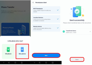 Step 3: After allowing the application to send data, proceed to your Google Pixel 8 Pro as a new device. On this Android, launch the app, select the “Phone to Phone” feature, and opt for the “New Phone” option for now. Now, you are prompted to grant the necessary permissions. Once permitted, connect your Samsung S23 Ultra and Google Pixel 8 Pro with a QR code. Your data will transfer seamlessly after developing a secure connection.