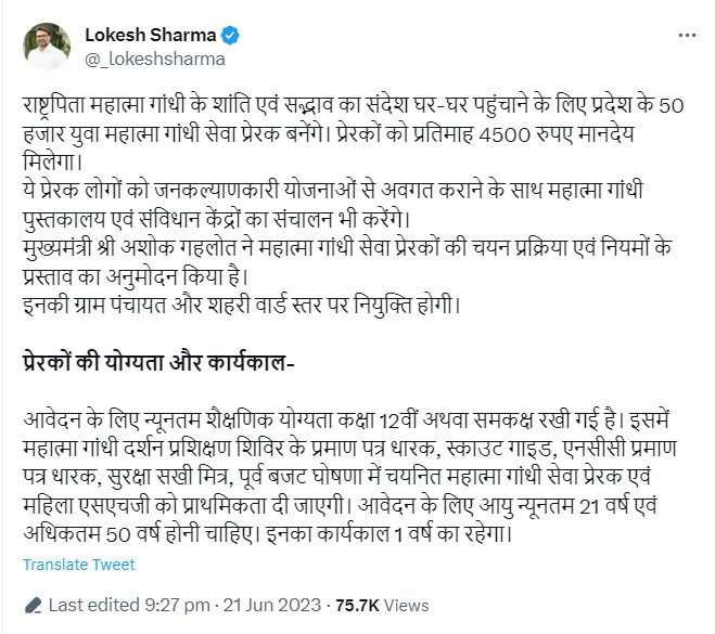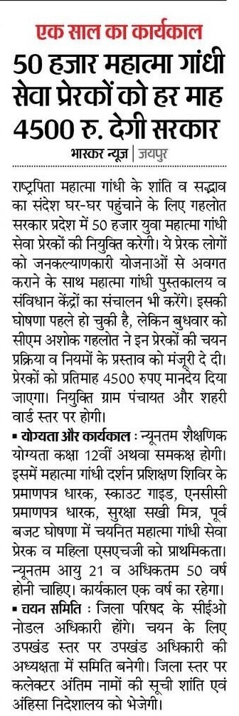 Rajasthan government is going to retain 50 thousand Mahatma Gandhi service motivators in the state. CM Ashok Gehlot has sanctioned the scheme for selection method and rules for Mahatma Gandhi seva Prerak. These youths will get a salary of Rs 4500 per month. They will be appointed at the gram panchayat and urban ward positions. Due to this, the government is working on taking its schemes to the public. This is also being considered as a new and unique trial.