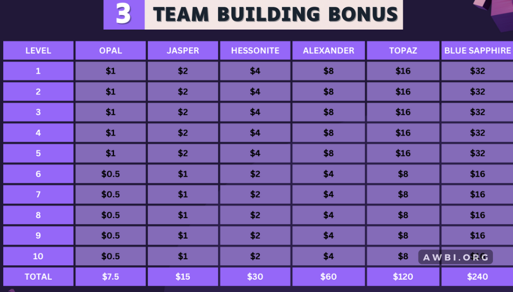Team Building Income is money you get for creating a group of people, like a team. In Tallwin Life, if you build a team that goes up to 10 levels, you’ll earn Team Building Income. The amount of money you earn depends on your rank, which is shown in the chart below. This chart helps you see how much you can earn.